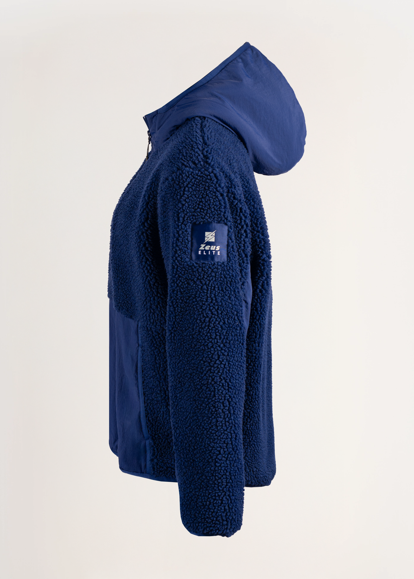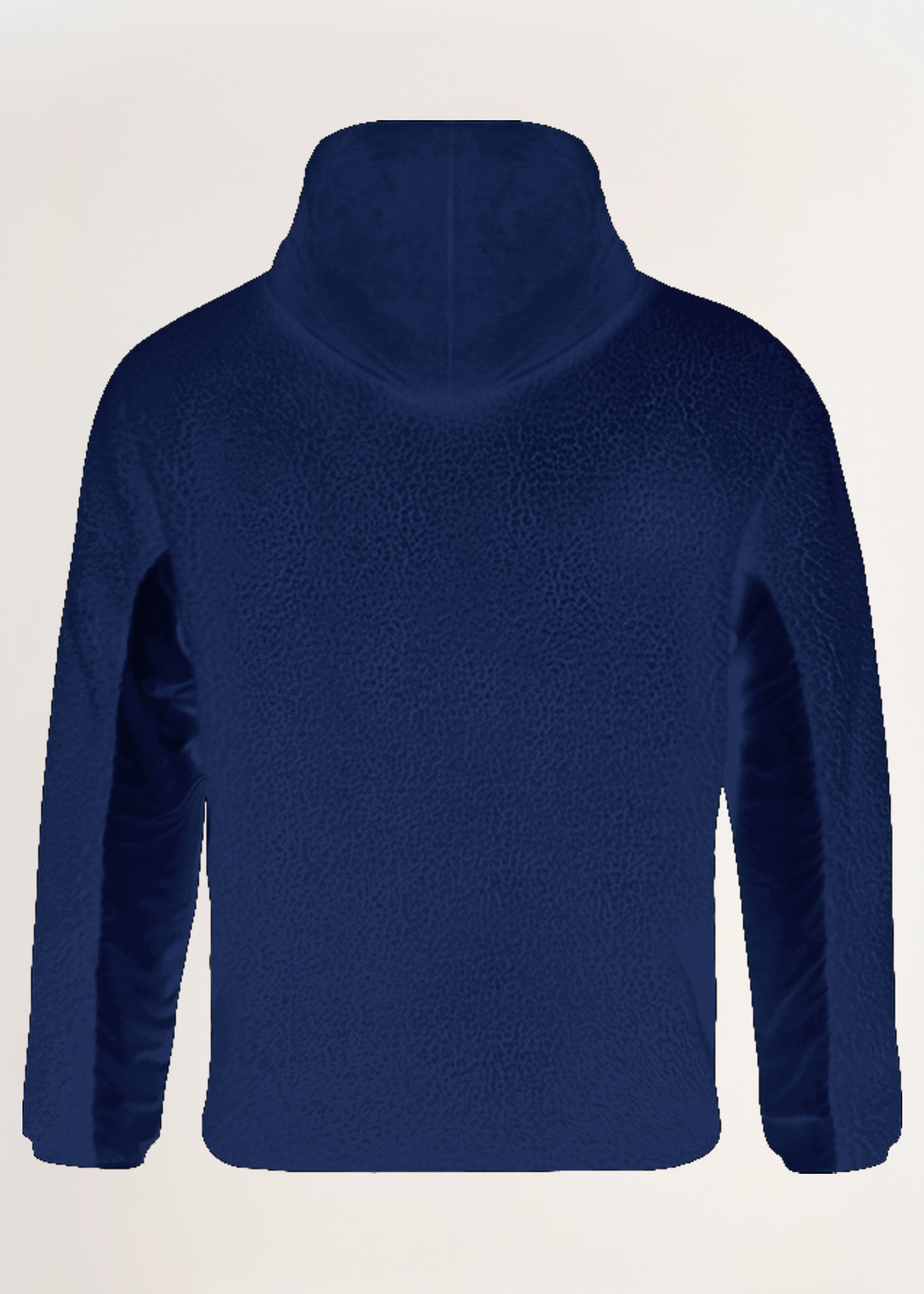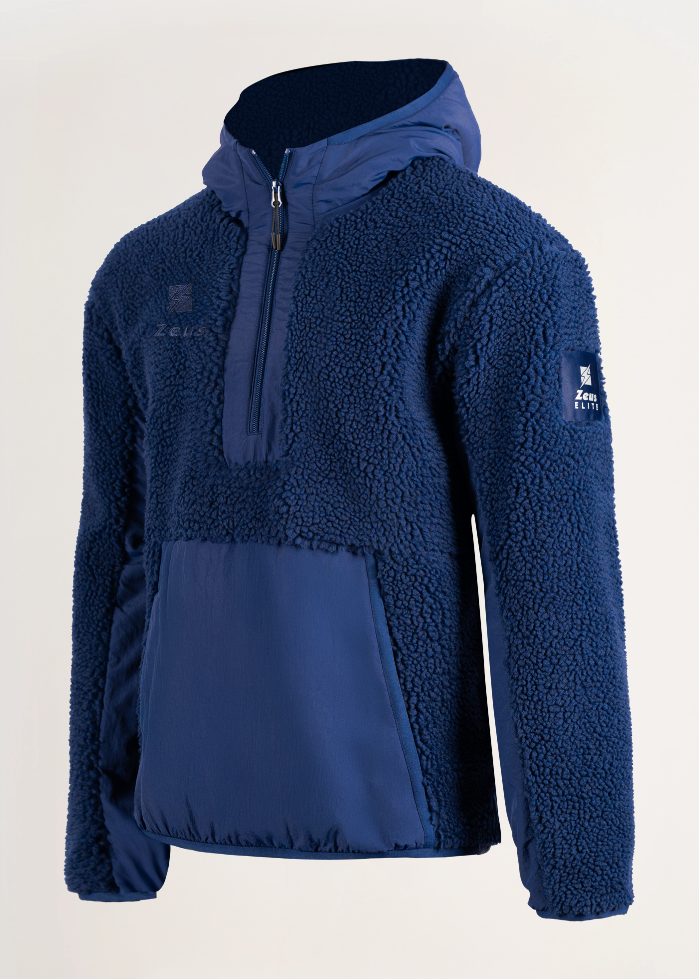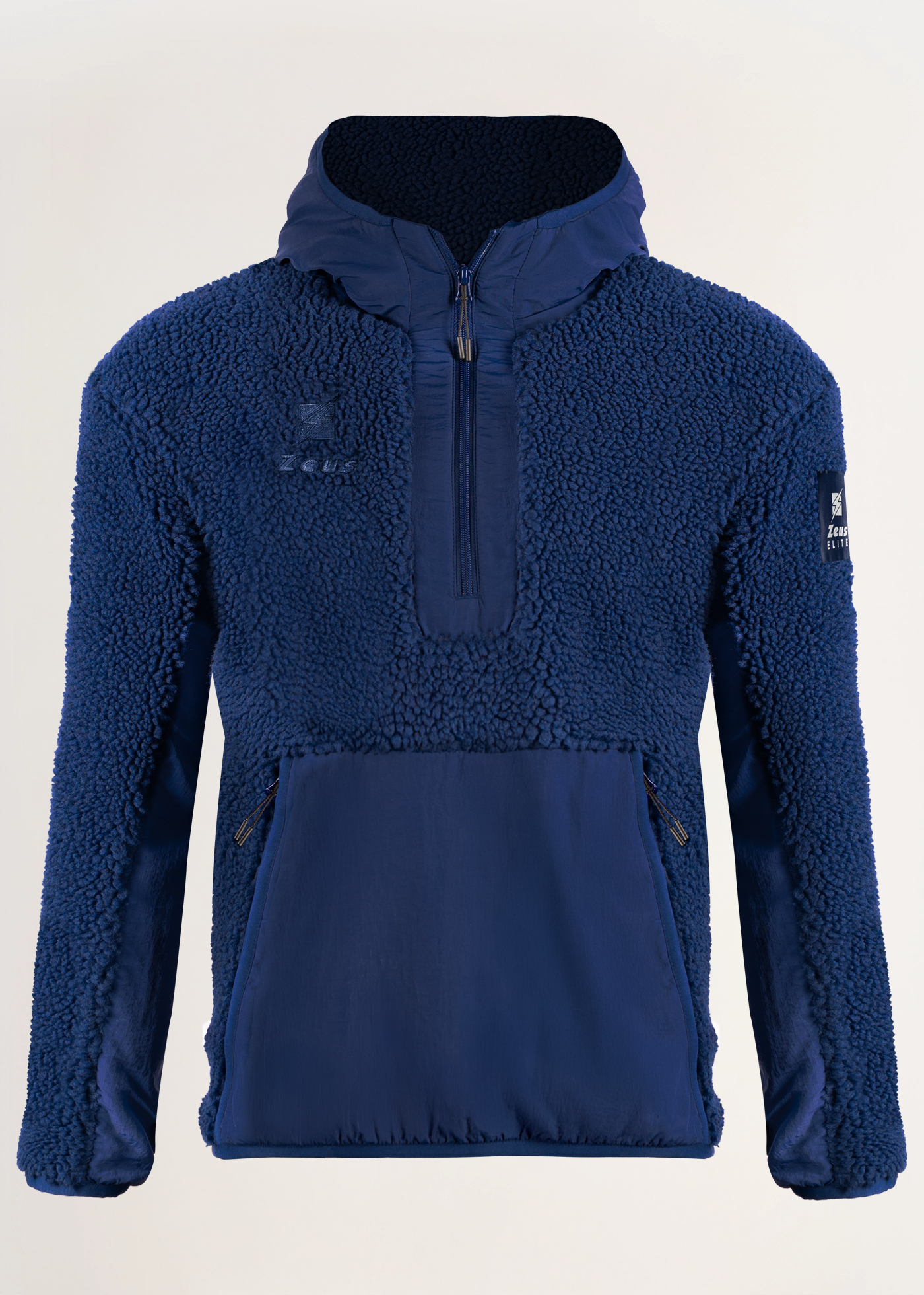 Fleece hoodie with half zip. Large front pocket with side zips. Embroidered Zeus logo.