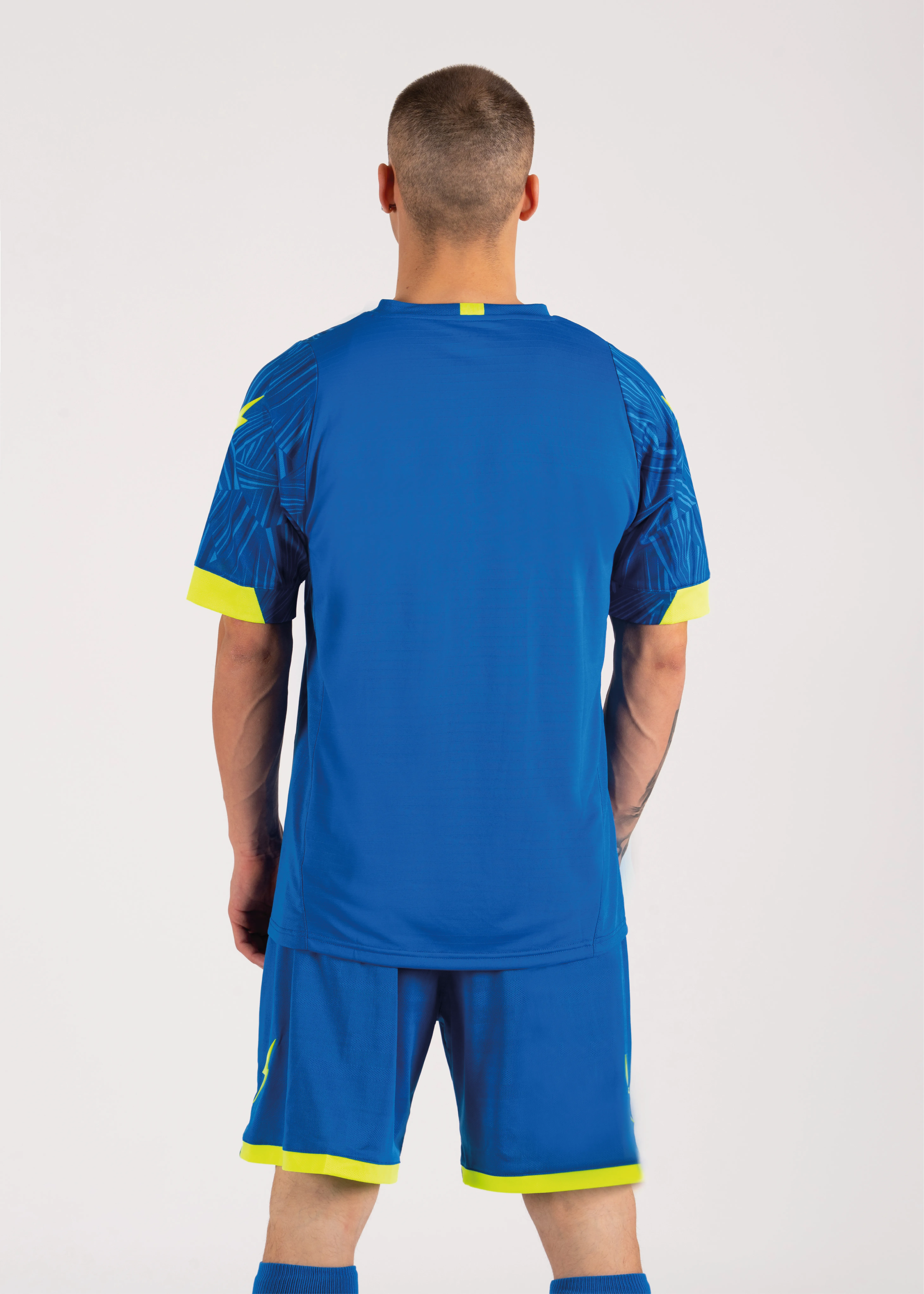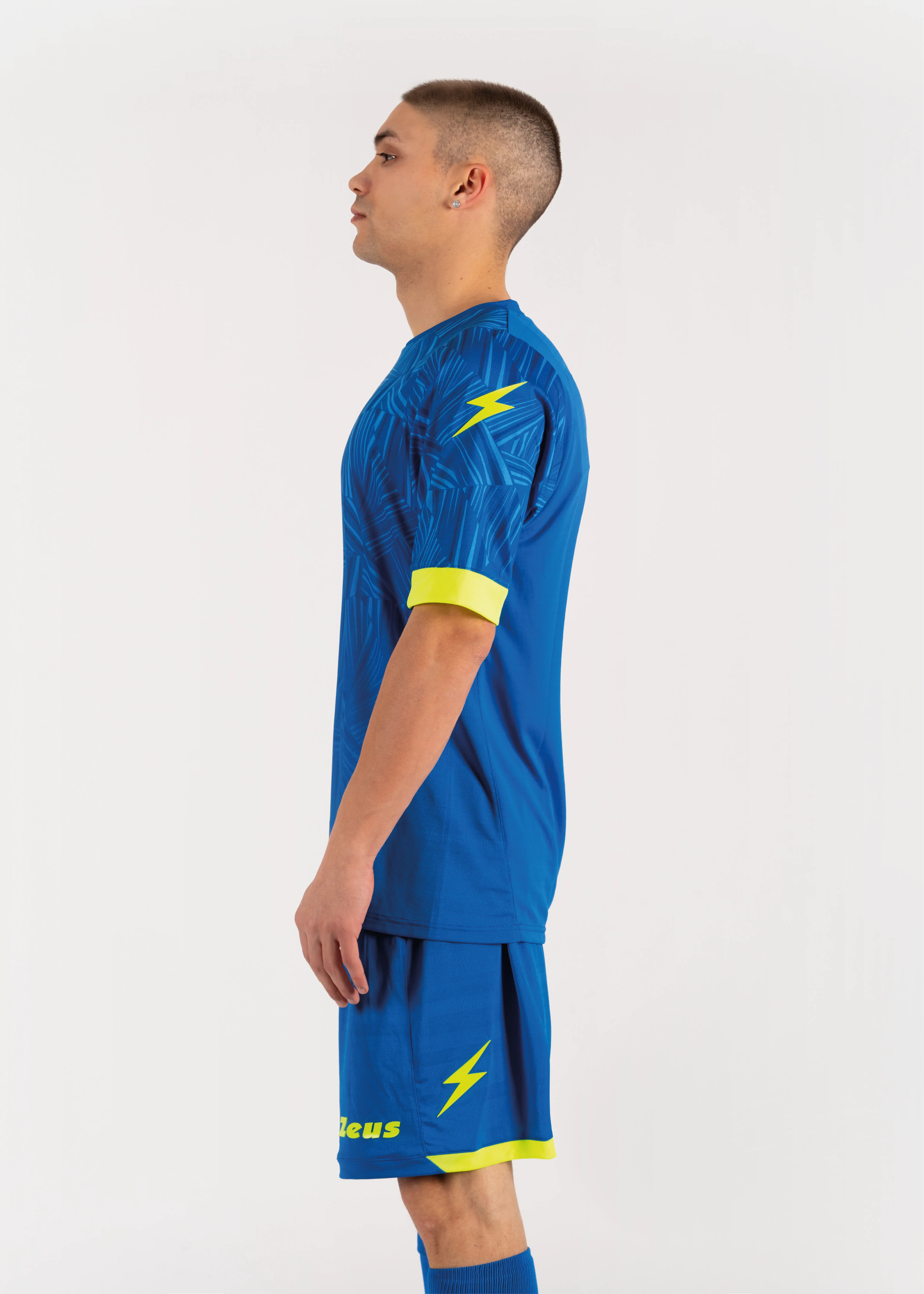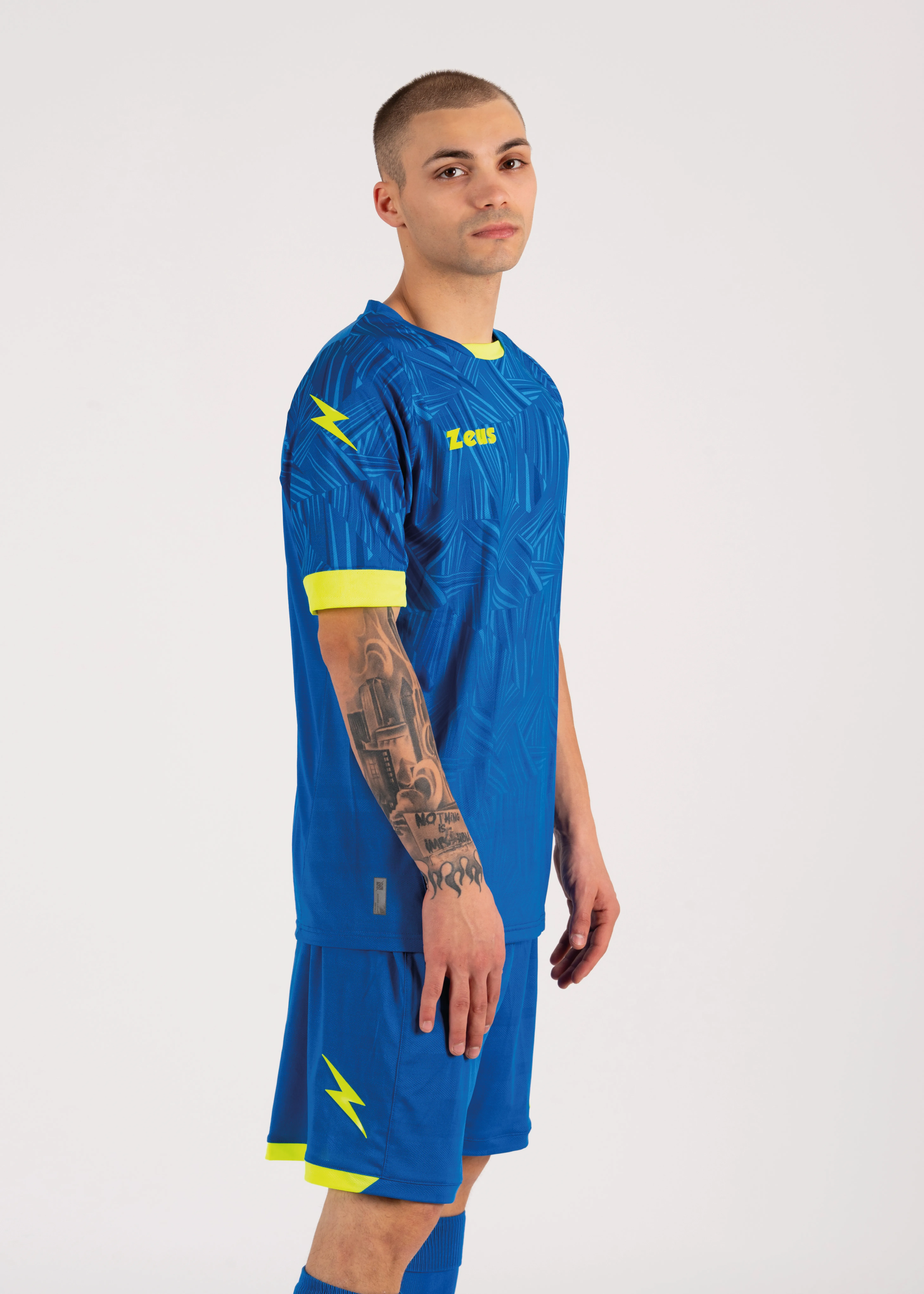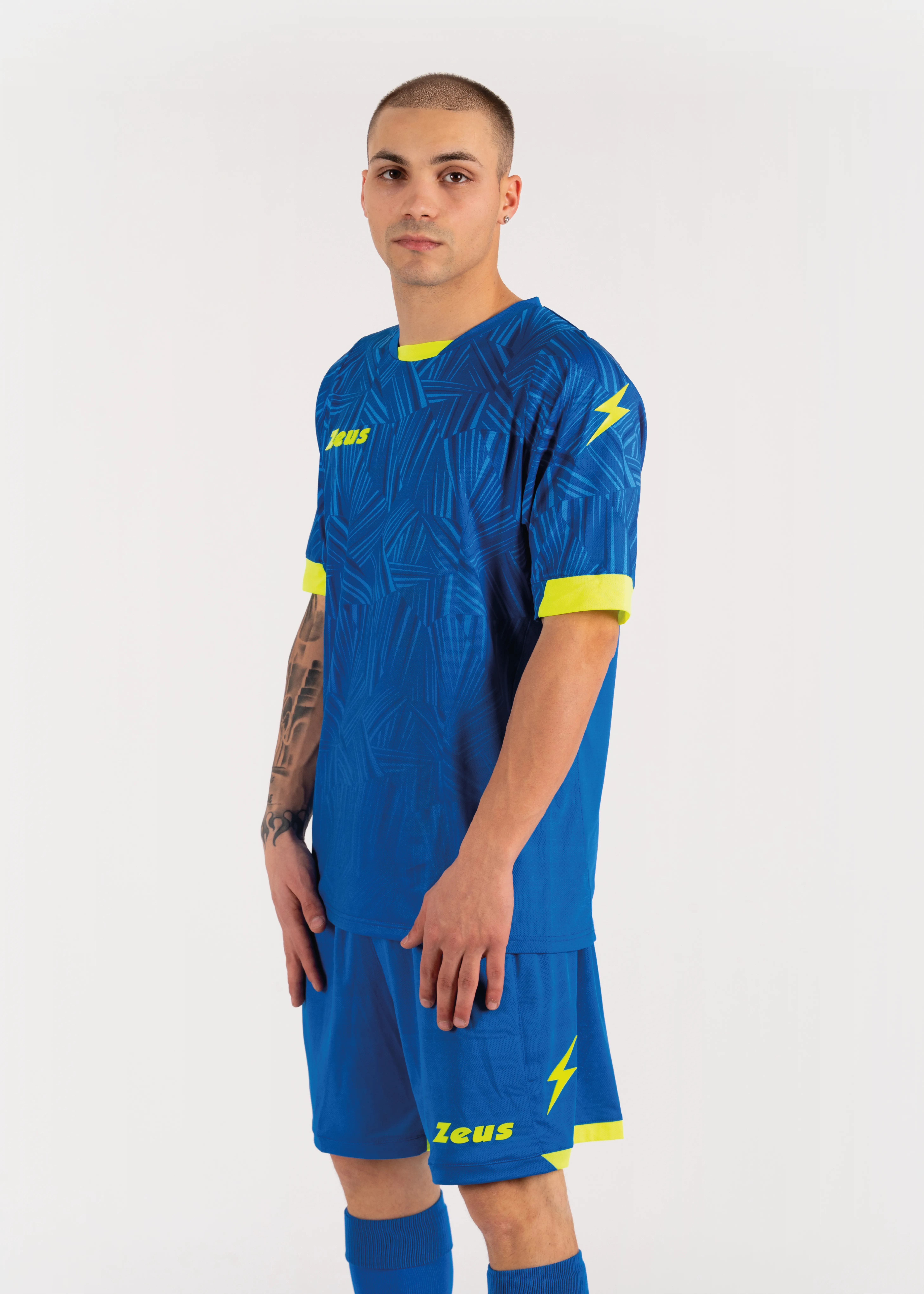 Kit consisting of a short-sleeved jersey with sublimated printed pattern, matched with shorts. The design is enhanced by inserts on the sleeves and collar, present on both the front and back. Zeus logos in silicon.
