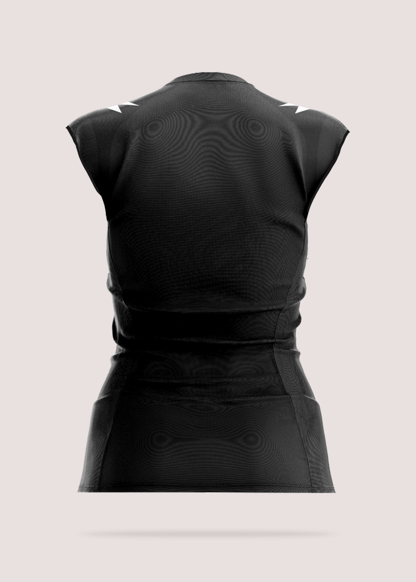 Short-sleeve technical volleyball jersey for women, made from lightweight and durable fabric, featuring breathable mesh side panels. The design is completed with a V-neck collar. Printed Zeus logos add a professional and recognizable look on the court.