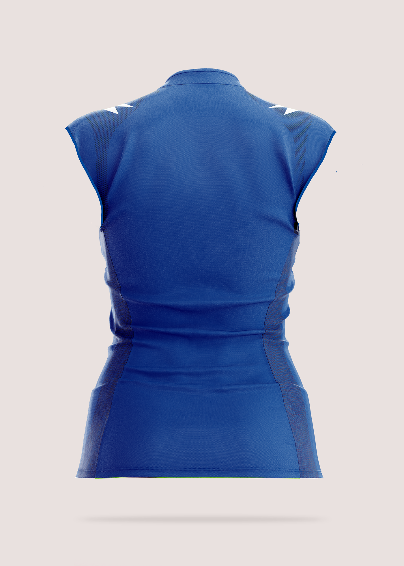 Short-sleeve technical volleyball jersey for women, made from lightweight and durable fabric, featuring breathable mesh side panels. The design is completed with a V-neck collar. Printed Zeus logos add a professional and recognizable look on the court.