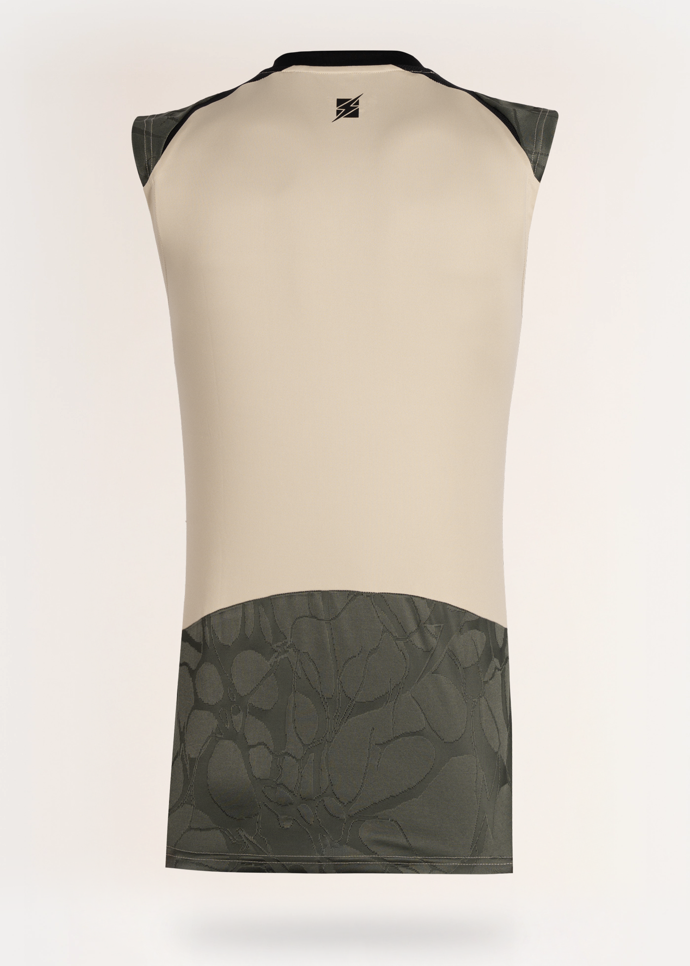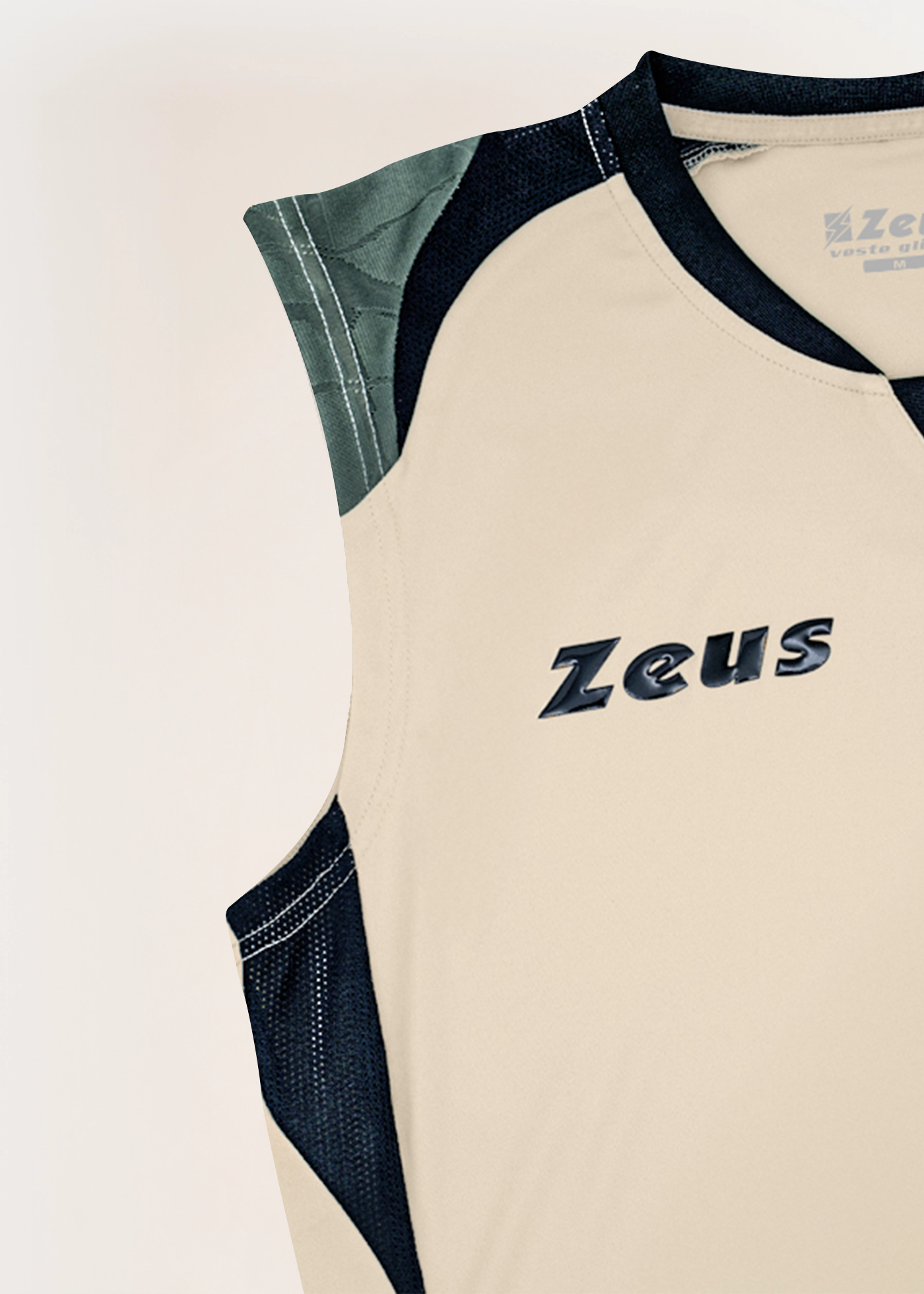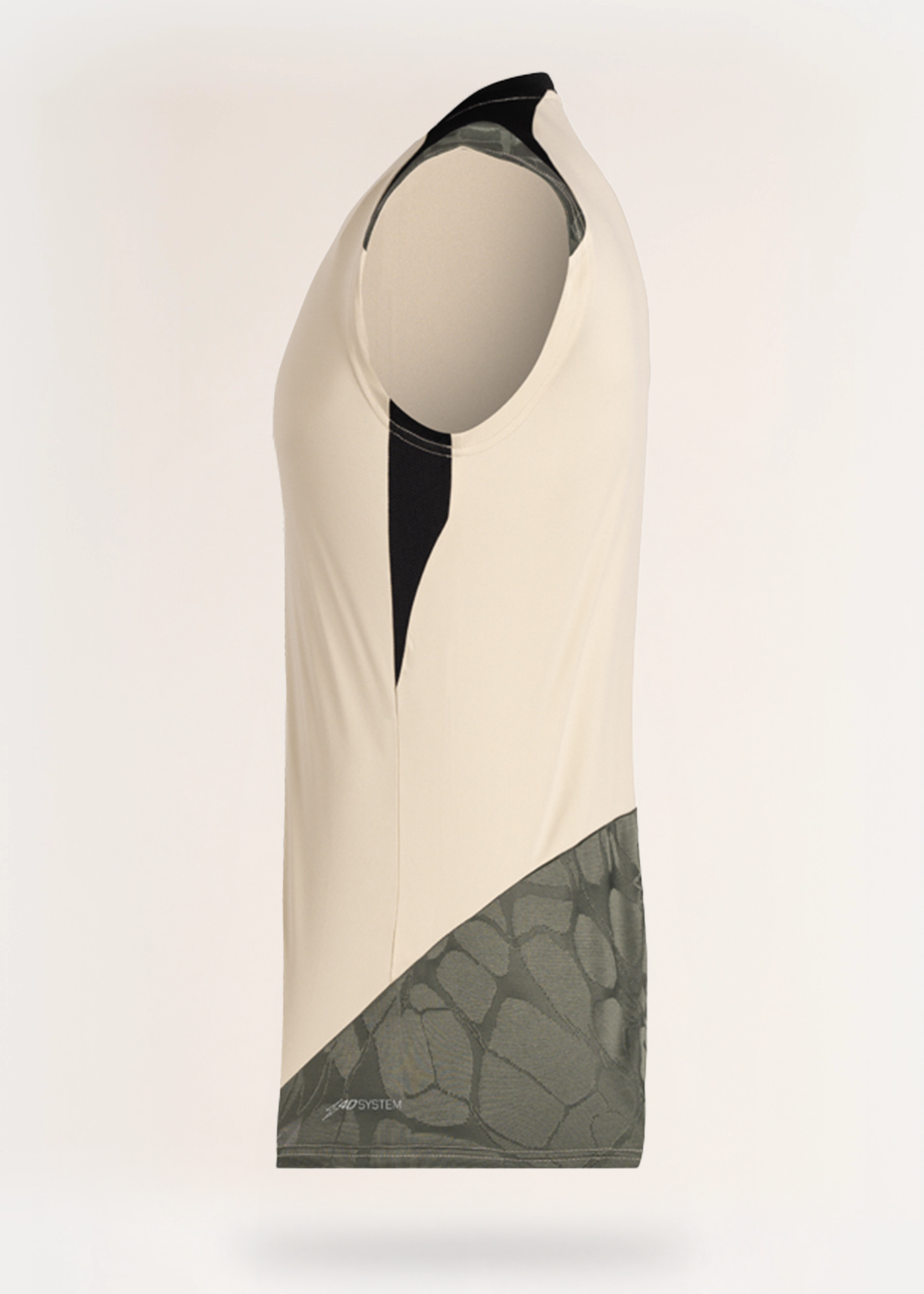 Débardeur d'entraînement respirant, léger et anti-transpiration. Réalisé avec la technologie 4D System. Logo Zeus en silicone. Insertions en jacquard sur les épaules, les côtés et le dos, conférant un aspect dynamique et une résistance accrue dans le te