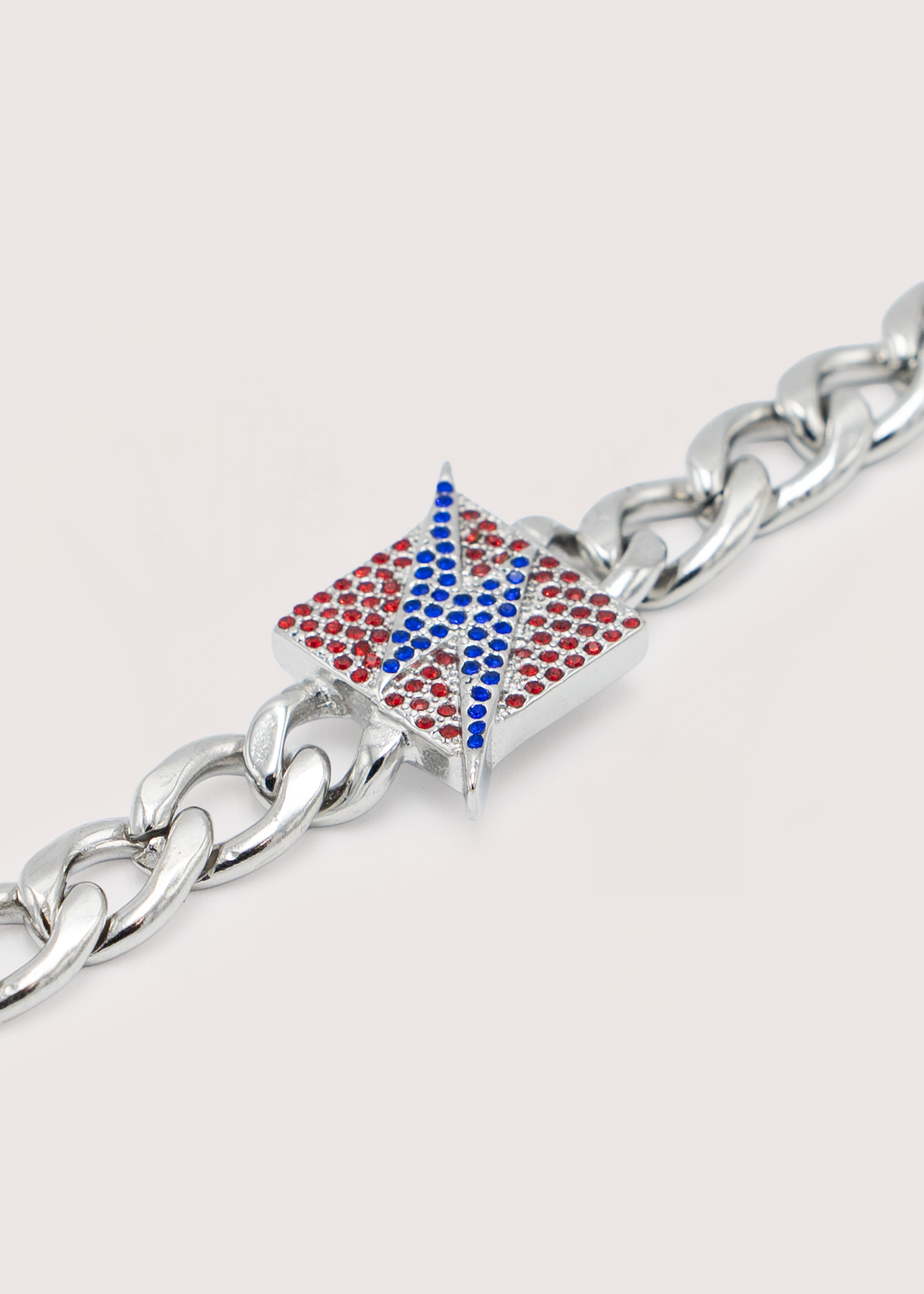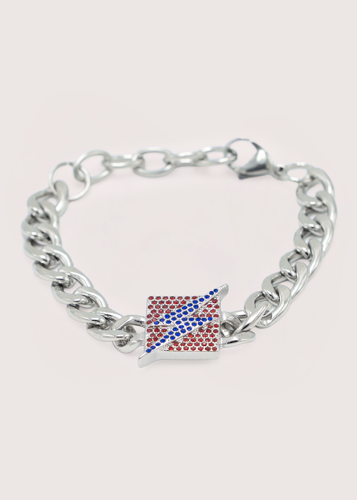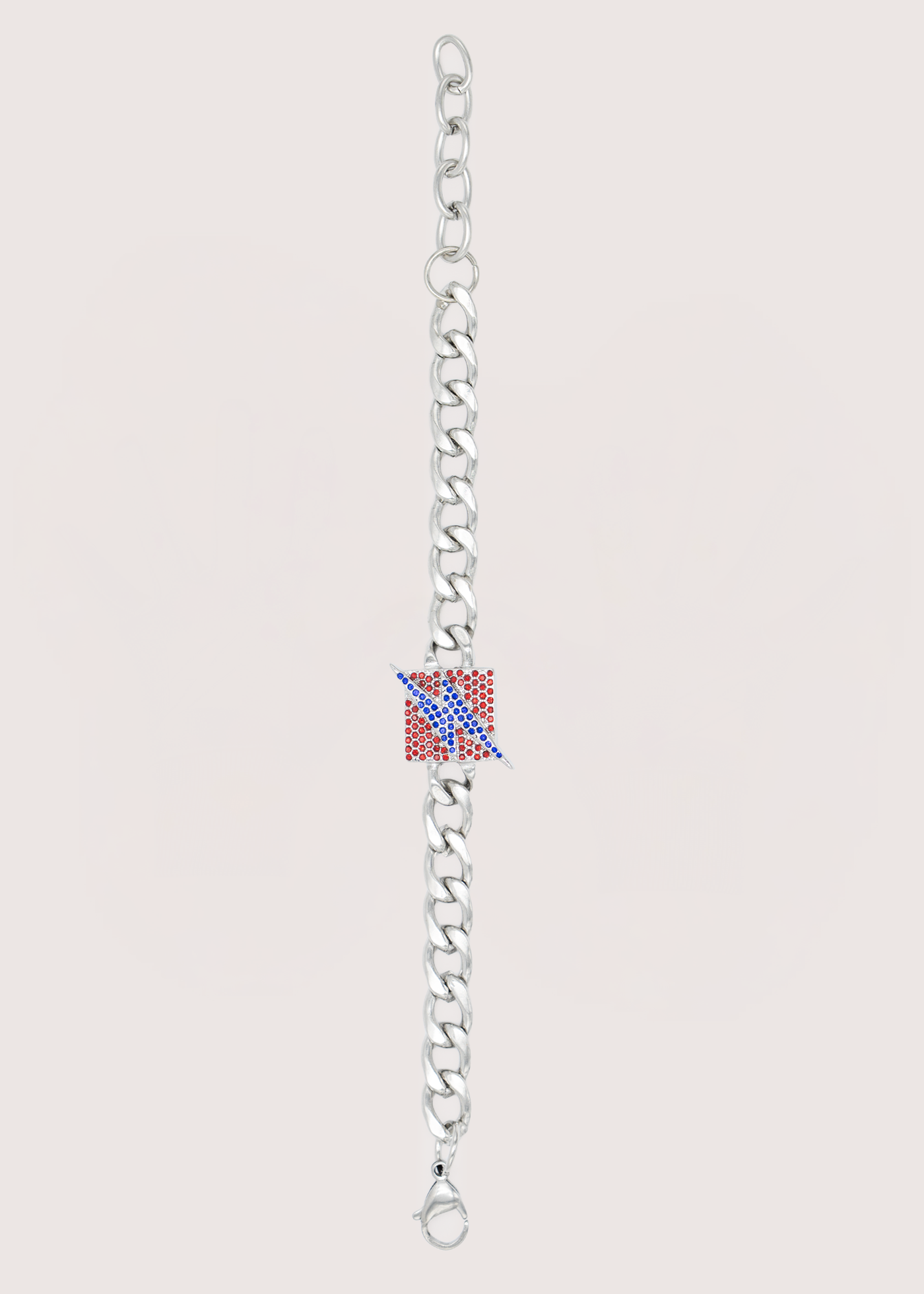 Bracciale in argento a maglie larghe, arricchito dal logo Zeus con delicati brillantini decorativi per un effetto luminoso ed elegante. Chiusura a moschettone.