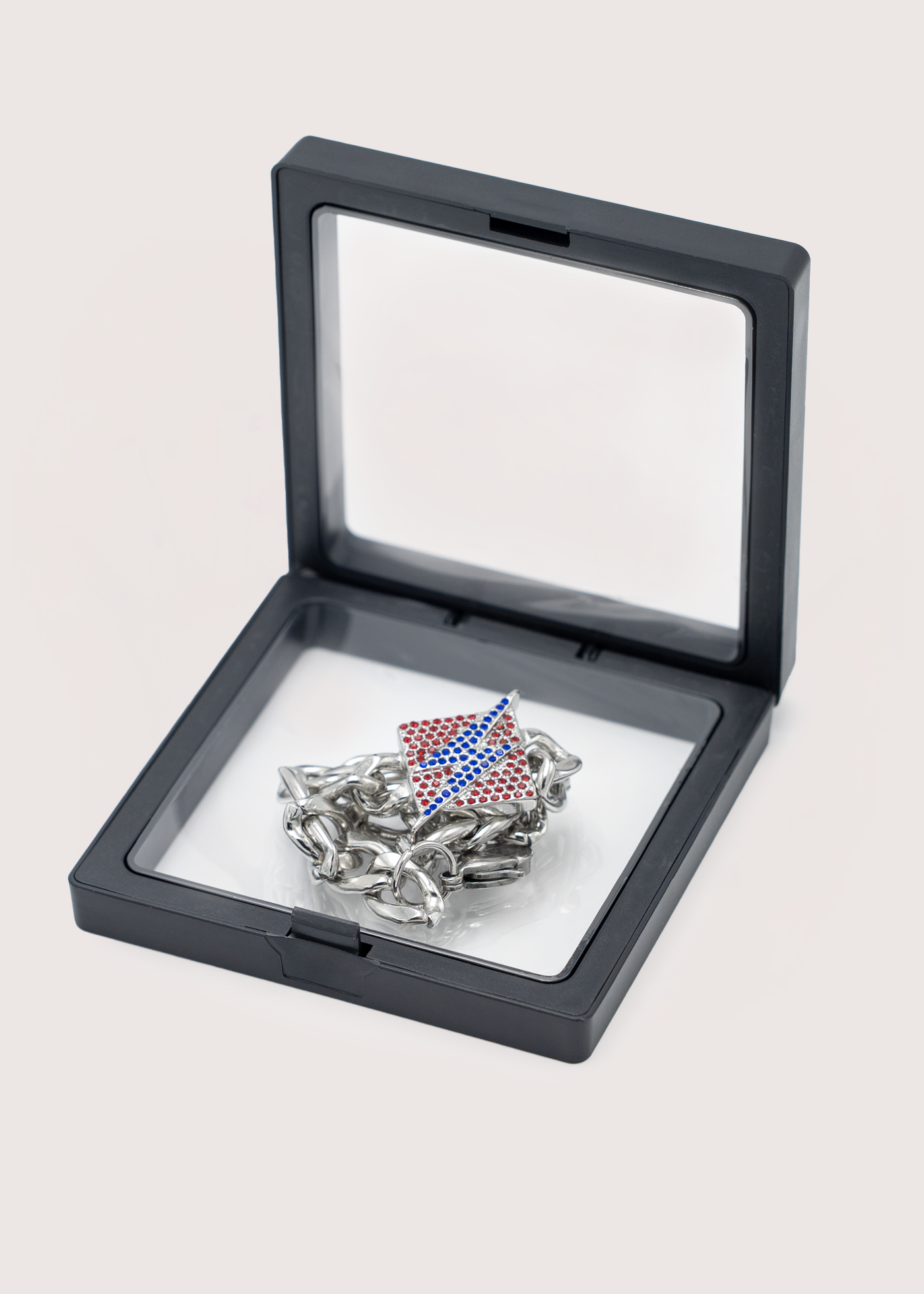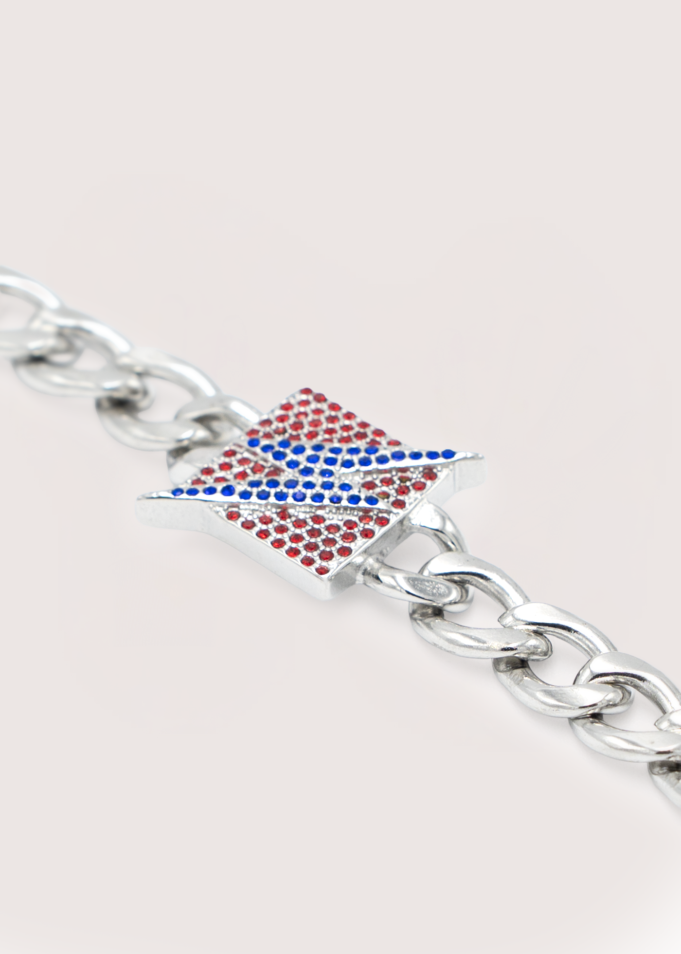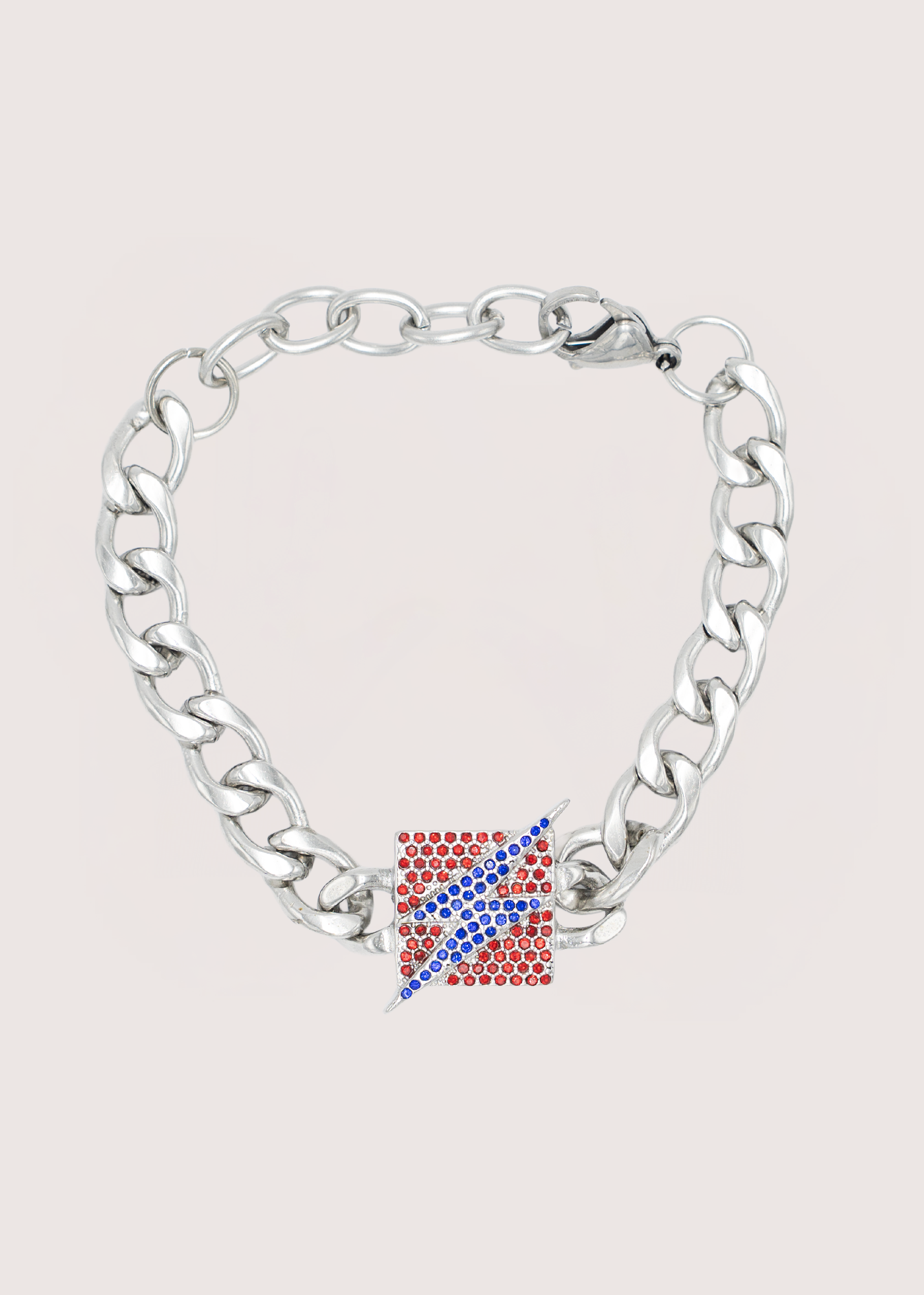 Bracciale in argento a maglie larghe, arricchito dal logo Zeus con delicati brillantini decorativi per un effetto luminoso ed elegante. Chiusura a moschettone.