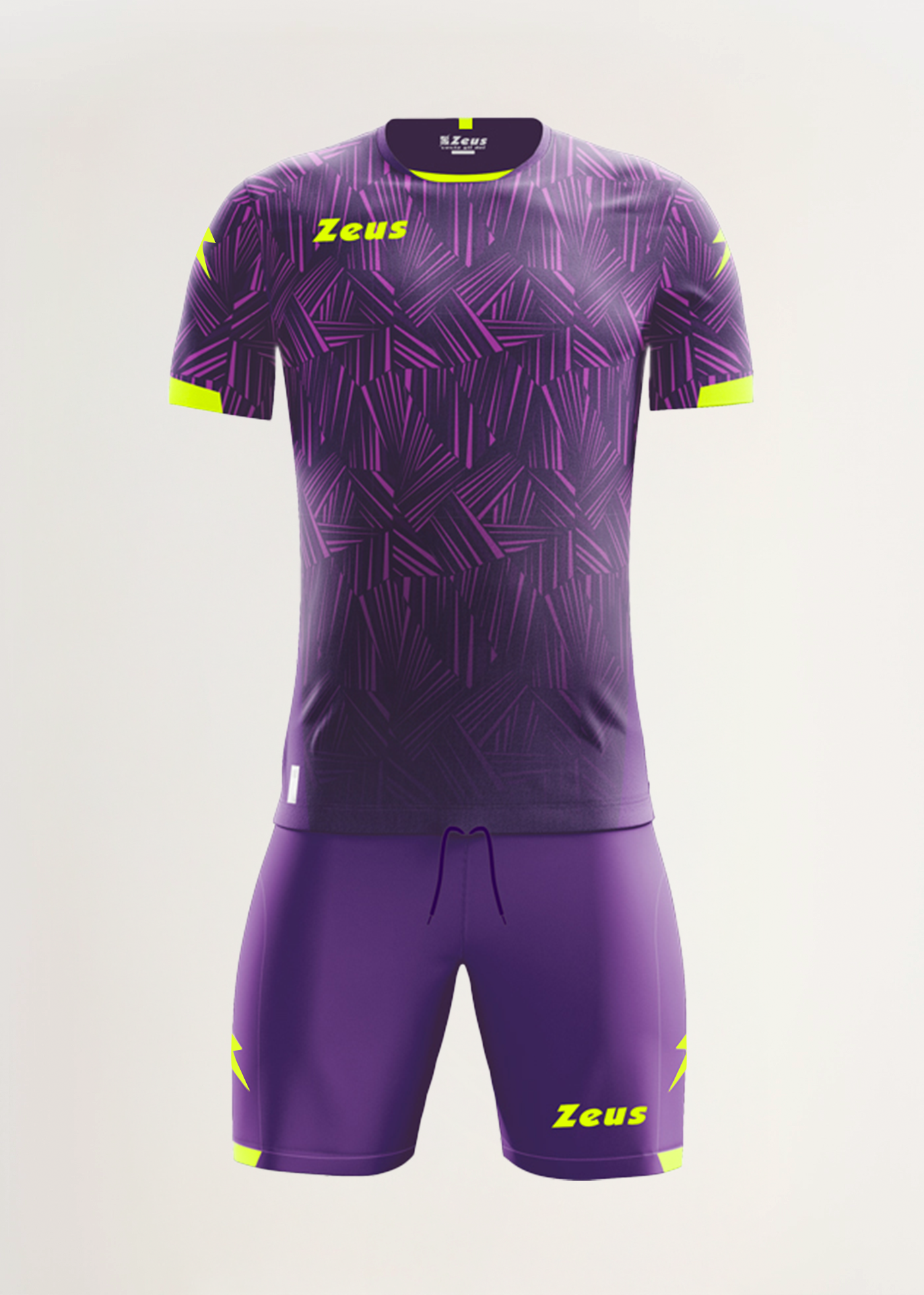 Kit composto da maglia a maniche corte con trama stampata in sublimatico, abbinata a pantaloncino. Il design è arricchito da inserti su maniche e colletto, presenti sia nella parte anteriore che posteriore. Loghi Zeus applicati in silicone.